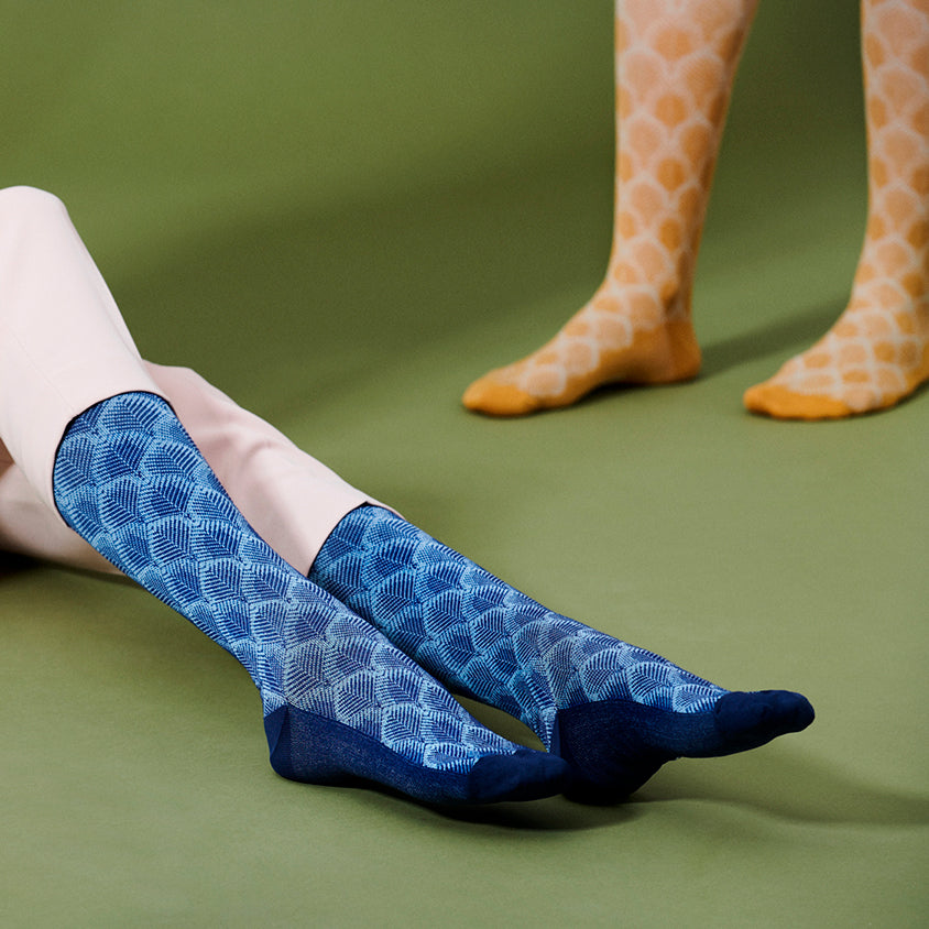 Stilrena stödstrumpor i bambu från SupCare, i en blå nyans med ett dekorativt lövmönster. Ett bekvämt och snyggt val för dig som vill kombinera funktion med design.