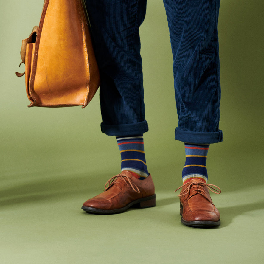 Bambustrumpor med medelhård kompression. Strumporna är blå med ränder i olika färger och bredd. Randiga stödstrumpor passar till ledig klädsel och piggar upp benen!<br /><br />Stödstrumpor passar bra för att hjälpa förebygga trötta, svullna ben. Till vardags, på jobbet, under resan; stödstrumpor håller dina ben pigga mycket längre. Unna dig och dina ben ett par av dessa fina och funktionella strumpor från SupCare.<br /><br />Bambufibrer gör strumporna mycket mjuka och sköna samtidigt som materialet har en svalkande effekt. Det gör dessa strumpor perfekt på flygresan.<br /><br /><strong>Storlek:</strong><br />Mät omkretsen på din ankel där den är som smalast och runt vaden där den är som bredast. Måtten bör tas på morgonen när fötter och ben inte är svullna.<br /><pre><strong>Storlek Ankelmått Vadmått</strong><br /><br />37-39 19-24 cm 28-40 cm<br /><br />40-42 21-26 cm 30-42 cm<br /><br />43-45 23-28 cm 32-44 cm</pre><br /><strong>Fakta:</strong><br />Kompression: 15-21 mmHg<br />Varumärke: SupCare<br /><br /><strong>Material: </strong><br />54% bambufibrer<br />40% polyamid<br />6% elastan<br /><br /><strong>Tvättråd: </strong><br />Tvättas i 40 grader<br />Torktumlas ej<br />Använd inte blekmedel