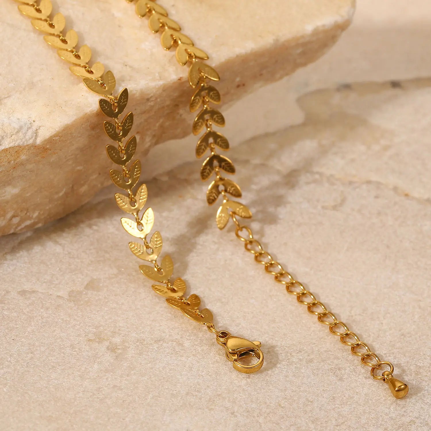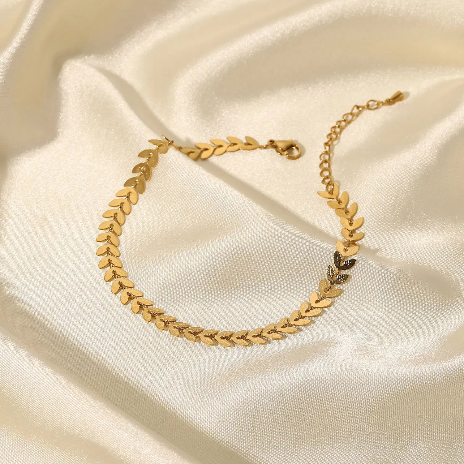 Elegant fotlänk i rostfritt stål med små dekorativa löv som ger ett mjukt och stilfullt uttryck.