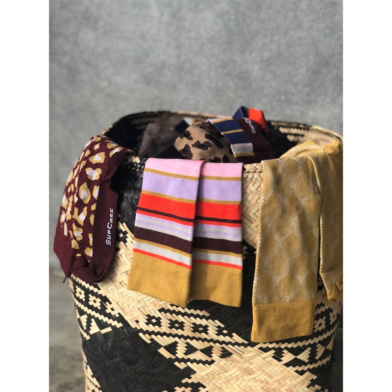 Bambustrumpor med kompression motsvarande klass 1. Strumporna är gula med ränder i olika färger och bredd. Bambufibrer gör strumporna mycket mjuka och sköna samtidigt som materialet har en svalkande effekt.<br /><br />Stödstrumpor passar bra för att hjälpa förebygga trötta, svullna ben. Till vardags, på jobbet, under resan, graviditeten; stödstrumpor håller dina ben pigga och motverkar åderbråck. Unna dig och dina ben ett par av dessa fina och funktionella strumpor från SupCare!<br /><br /><strong>Storlek:</strong><br />Mät omkretsen på din ankel där den är som smalast och runt vaden där den är som bredast. Måtten bör tas på morgonen när fötter och ben inte är svullna.<br /><pre><strong>Storlek Ankelmått Vadmått</strong><br /><br />37-39 19-24 cm 28-40 cm<br /><br />40-42 21-26 cm 30-42 cm<br /><br />43-45 23-28 cm 32-44 cm</pre><br /><strong>Fakta:</strong><br />Kompression: 15-21 mmHg<br />Varumärke: SupCare<br /><br /><strong>Material: </strong><br />54% bambufibrer<br />40% polyamid<br />6% elastan<br /><br /><strong>Tvättråd: </strong><br />Tvättas i 40 grader<br />Torktumlas ej<br />Använd inte blekmedel