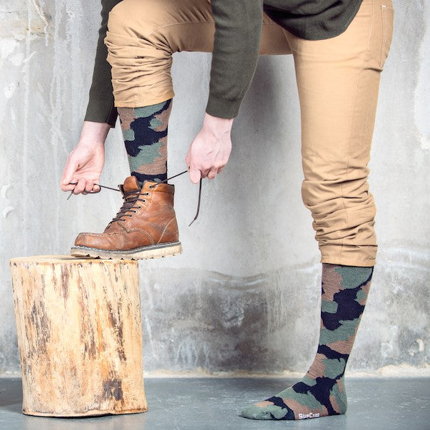 Fräcka stödstrumpor med klassiskt militärmönster – ett tufft och lekfullt val för dig som vill sticka ut även under aktivitet.
