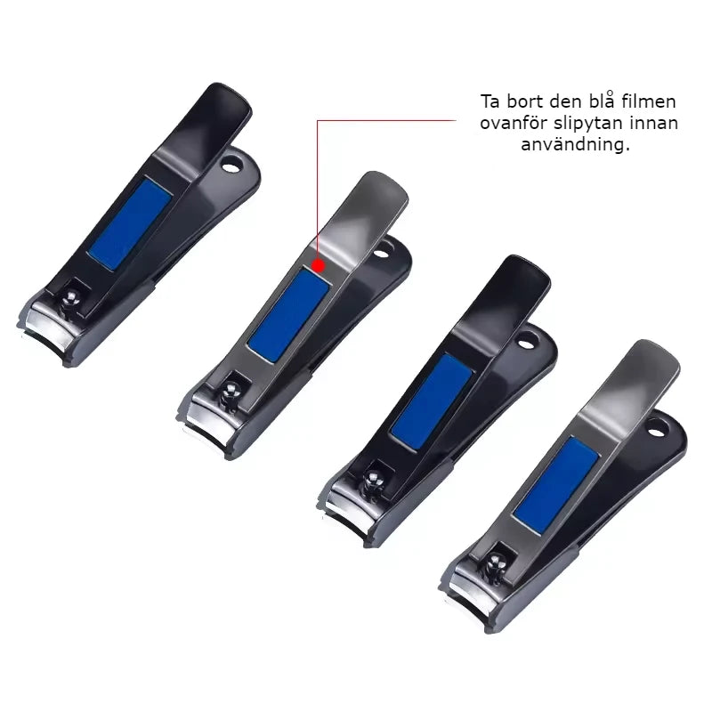 OBS: Den blå skyddsfilmen över slipytan ska tas bort innan nagelklipparen används första gången.