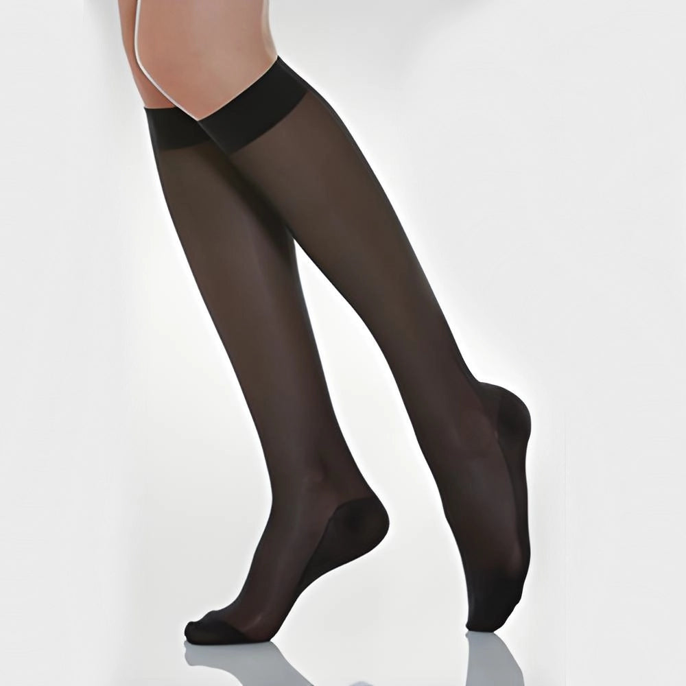 Knähöga stödstrumpor med mild kompression för dig som vill ge benen extra komfort och en piggare känsla efter långa dagar med mycket stillasittande eller stående.