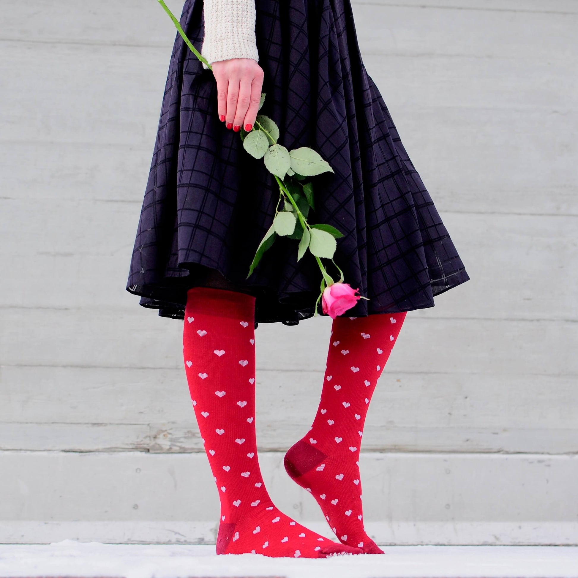 Ljuvliga stödstrumpor i rött och rosa som ger ett mjukt, lekfullt uttryck och sätter färg på din outfit.