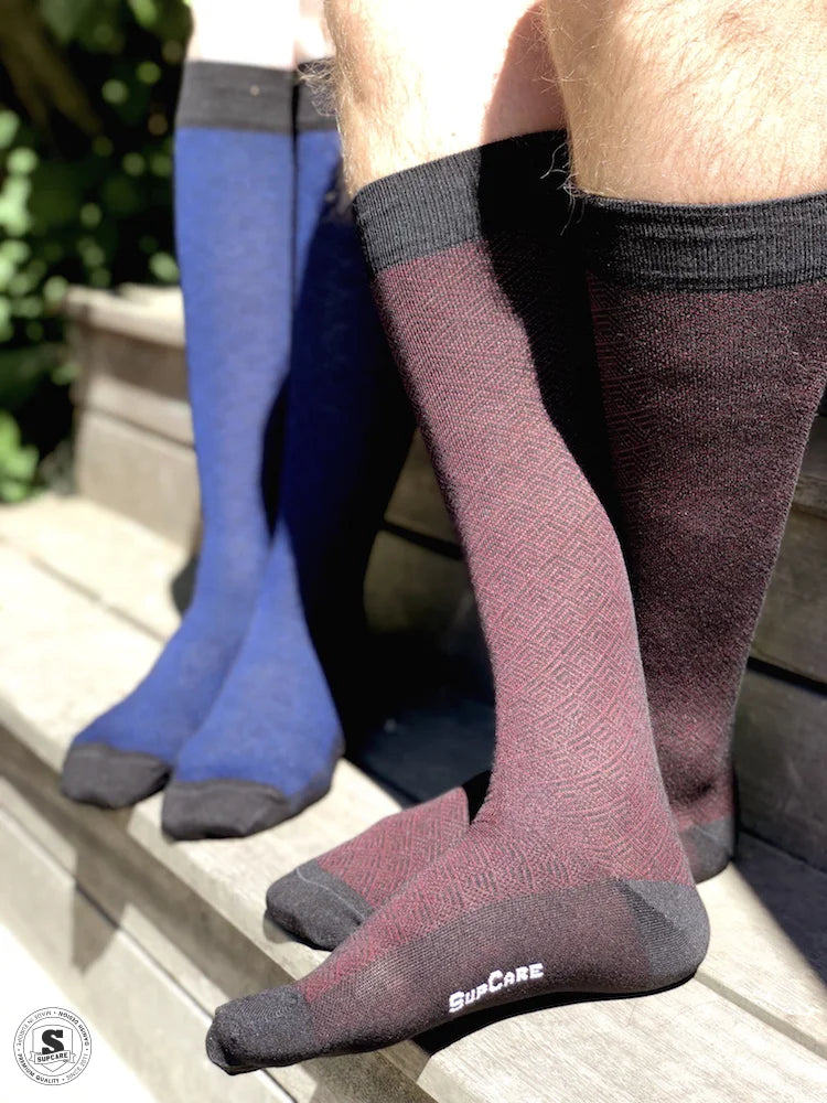 Svarta stödstrumpor med diskret rött mönster i mjuk bambu