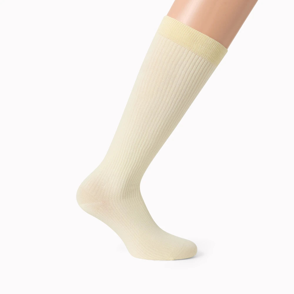 Mjuka, ribbade stödstrumpor i bomull med lätt kompression 15-20 mmHg. One-size 35-39. Perfekta för vardag eller resa.