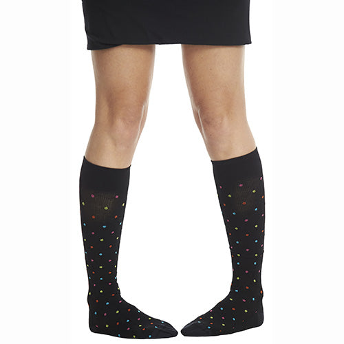 Svarta stödstrumpor med små färgglada prickar som ger en lekfull detalj till en annars stilren design.