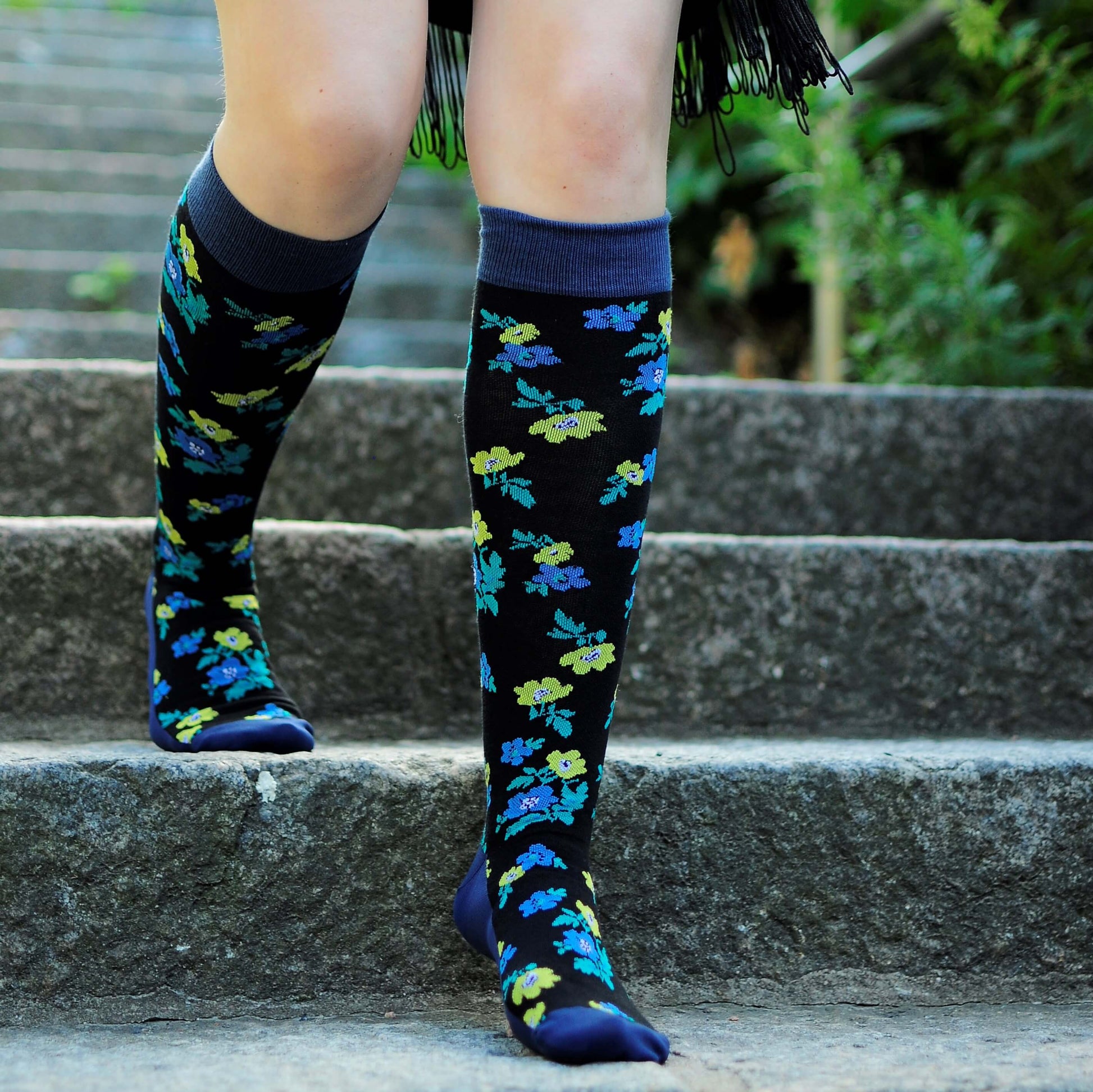 Svarta stödstrumpor från SupCare med ett fint blommönster i gult och blått som ger ett personligt och livfullt uttryck.